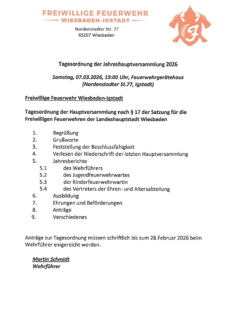 Die Freiwillige Feuerwehr Wiesbaden-Igstadt lädt alle Mitglieder herzlich zur Jahreshauptversammlung 2026 ein. Samstag, 07. März 2026 Beginn: 19:00 Uhr Feuerwehrgerätehaus Igstadt, Nordenstadter Straße 77 Auf der Tagesordnung stehen unter anderem die Jahresberichte der Einsatzabteilung, der Jugend- und Kinderfeuerwehr sowie der Ehren- und Altersabteilung. Zudem wird über Ausbildungsthemen informiert, Ehrungen und Beförderungen vorgenommen und aktuelle Anträge behandelt. Anträge zur Tagesordnung müssen schriftlich bis zum 28. Februar 2026 beim Wehrführer eingereicht werden. Die Einladung richtet sich an alle Mitglieder der Freiwilligen Feuerwehr Igstadt.