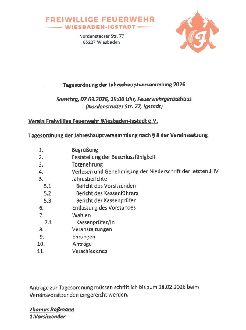 Der Verein Freiwillige Feuerwehr Wiesbaden-Igstadt e. V. lädt alle Mitglieder zur Jahreshauptversammlung 2026 ein. Termin: Samstag, 07. März 2026 Uhrzeit: 19:00 Uhr Ort: Feuerwehrgerätehaus Igstadt, Nordenstadter Straße 77 Im Rahmen der Versammlung werden die Berichte des Vorstandes, des Kassenführers und der Kassenprüfer vorgestellt. Weitere Punkte sind die Entlastung des Vorstandes, die Wahl eines Kassenprüfers bzw. einer Kassenprüferin, Informationen zu anstehenden Veranstaltungen sowie Ehrungen und Anträge. Anträge zur Tagesordnung müssen schriftlich bis spätestens 28. Februar 2026 beim Vereinsvorsitzenden eingereicht werden. Die Einladung richtet sich an alle Mitglieder des Vereins.