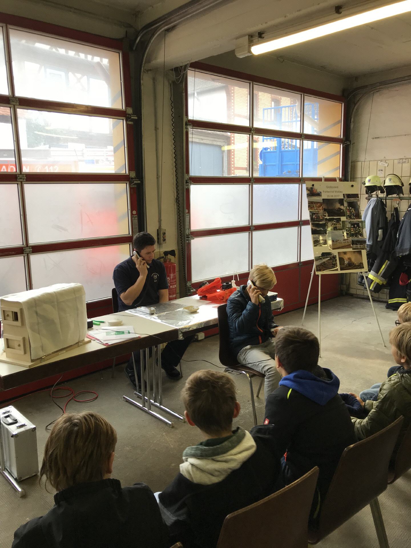 Danach wurde mit einem kleinen Rauchhaus mittels einer Nebelmaschine und Spielfiguren ein Wohnungsbrand dargestellt, bei dem den Kinder demonstriert werden sollten, welche Gefahren es gibt und wie man sich bis zum Eintreffen der Einsatzkräfte richtig zu verhalten hat. Dann wurde die Klasse in zwei Gruppen aufgeteilt. Dabei galt es bei der einen Gruppe den richtigen Notruf abzusetzen. Mit Hilfe einer eigens dafür entworfenen Telefonanlage konnten die Brandschutzerzieher zusammen mit den Grundschülern das korrekte Telefonieren mit der Leitstelle trainieren..